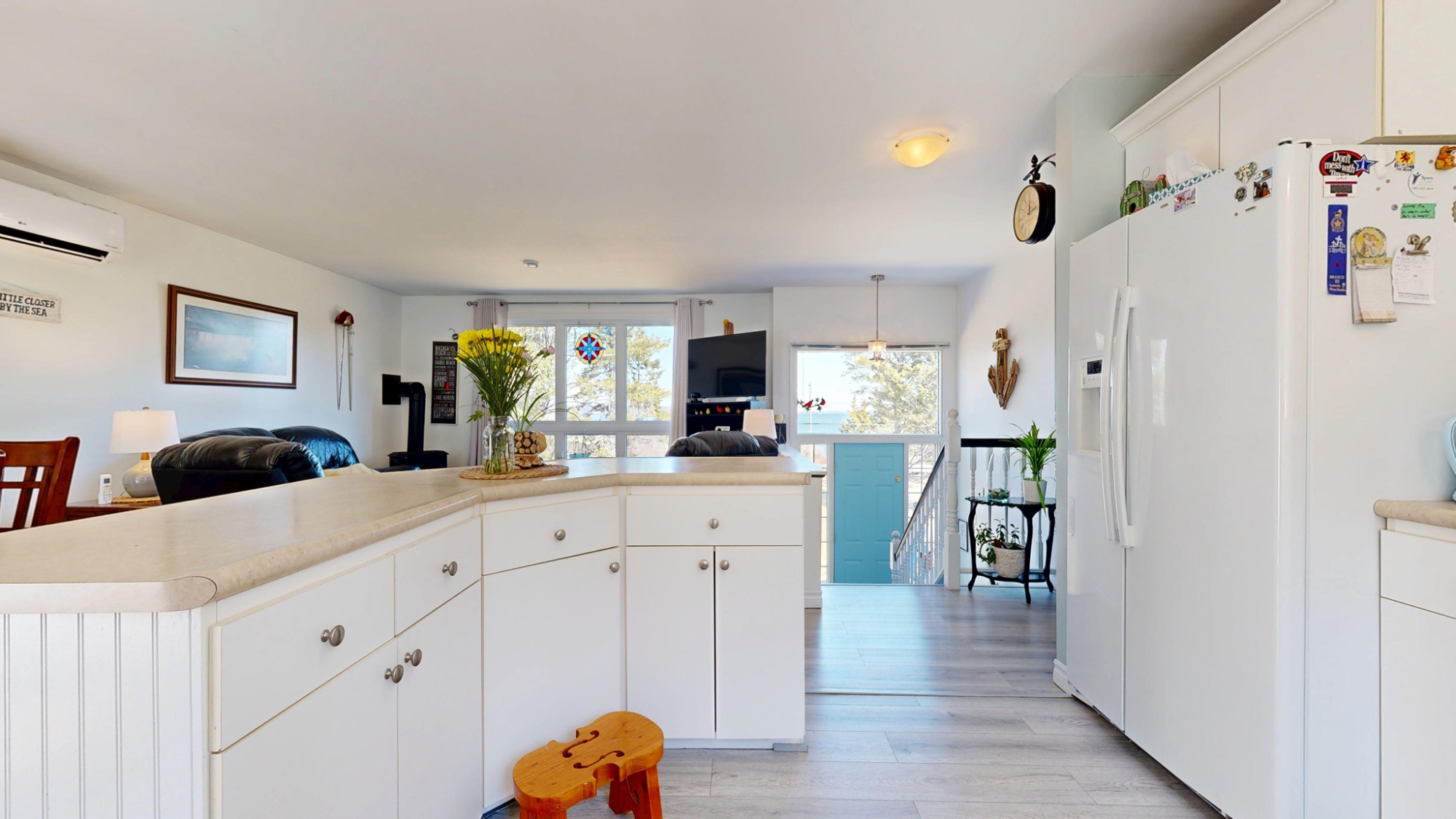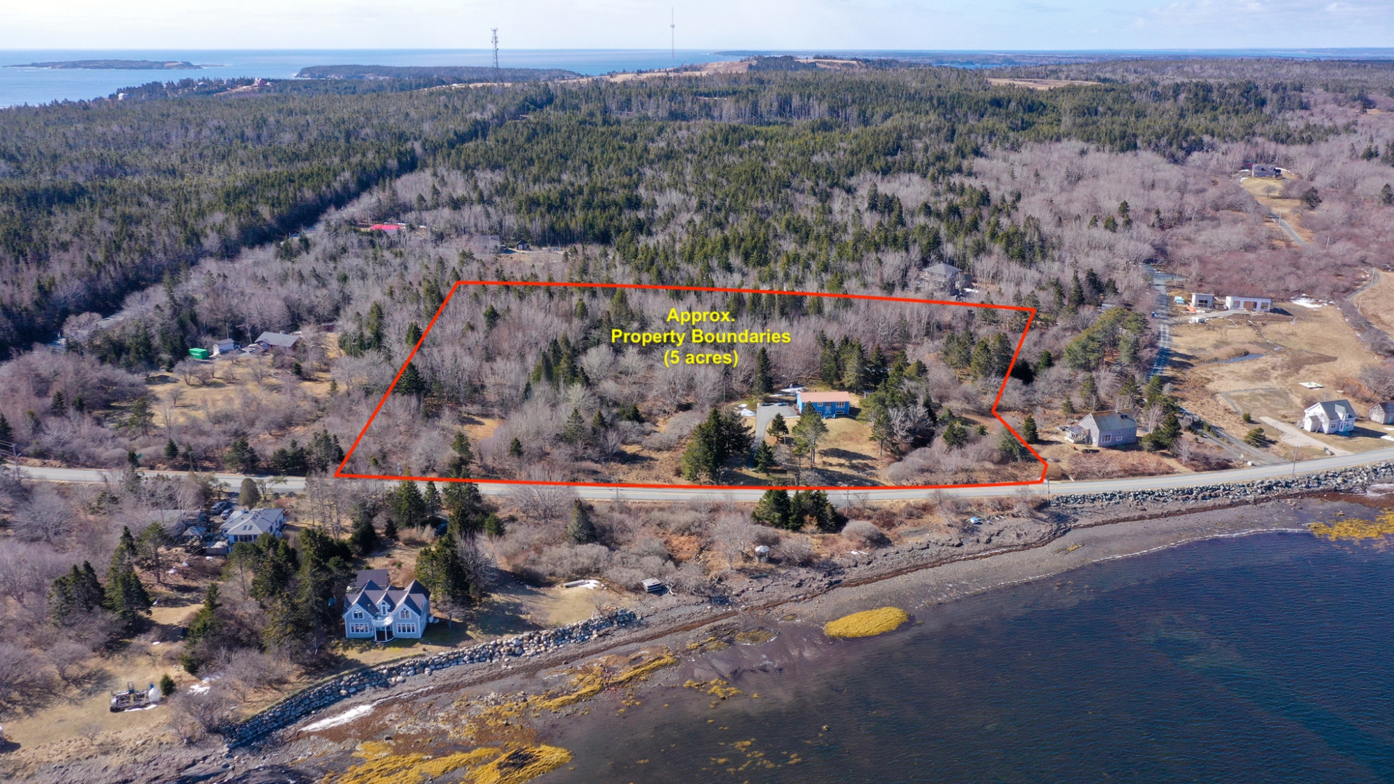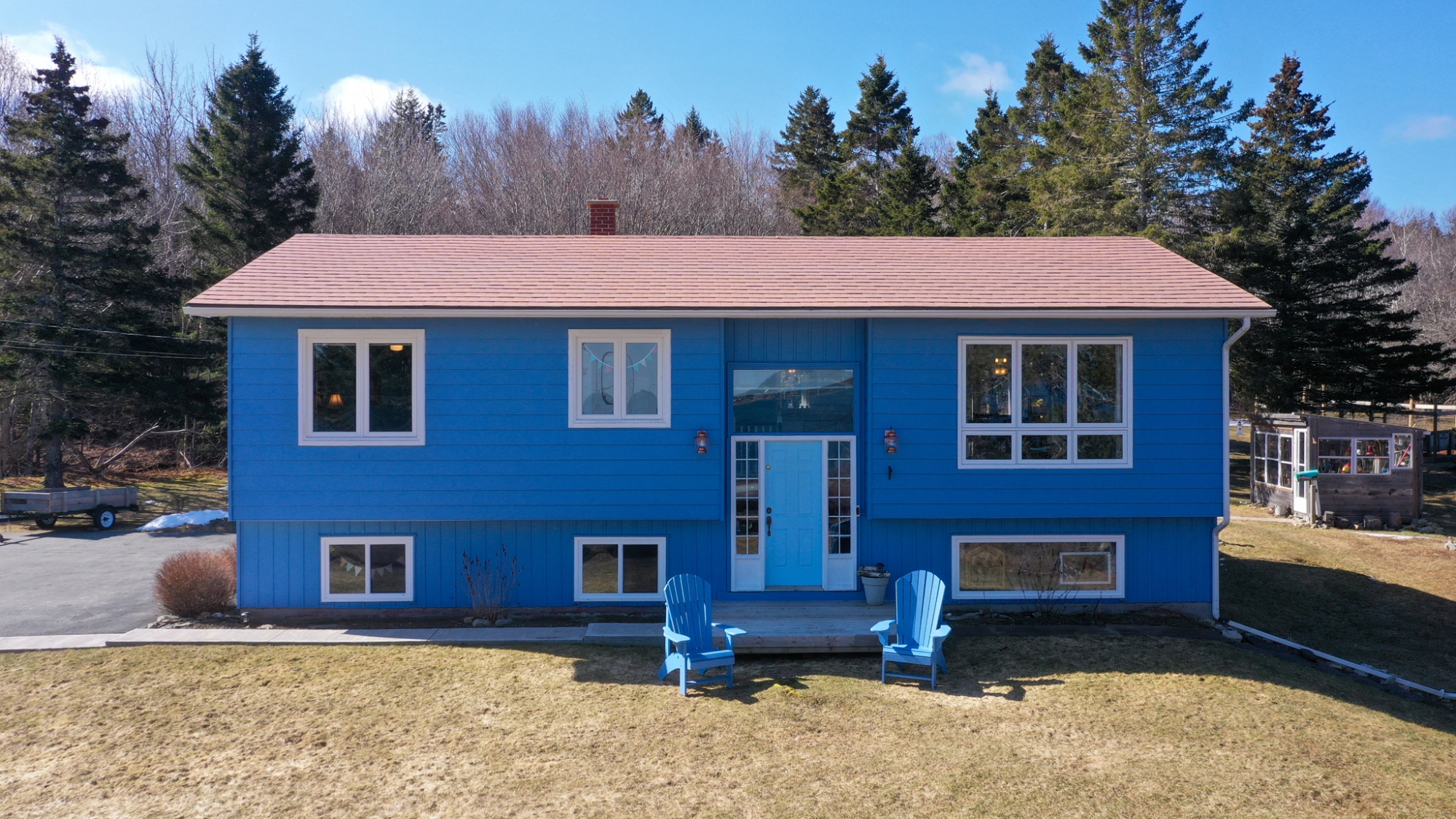 Set well off the road on a private 5-acre parcel is this cheerful 2 level coastal home.  The split-level design affords large windows on both floors, and pretty views from almost every window…watch tall ships in the distance sailing in and out of Lunenburg Bay, or closer to shore, local Lobsterman working their traps.