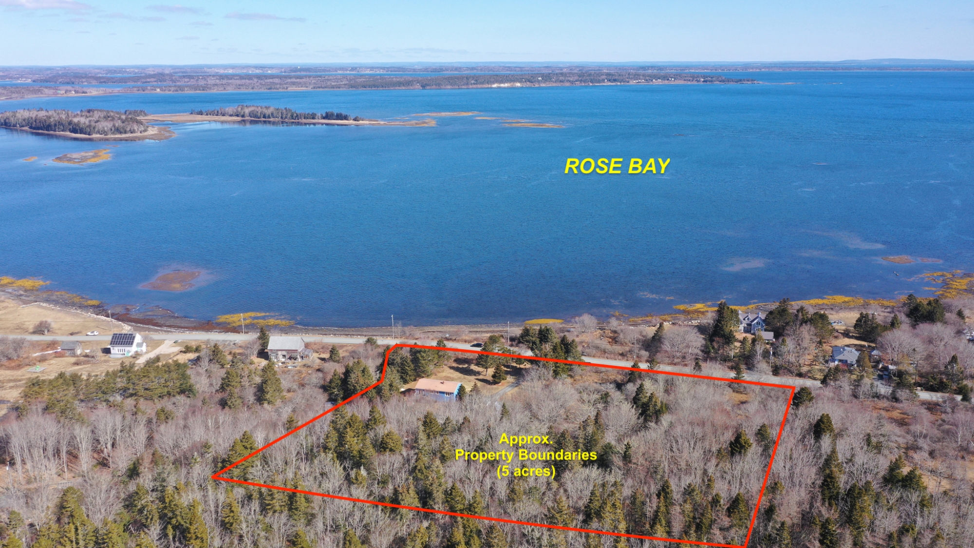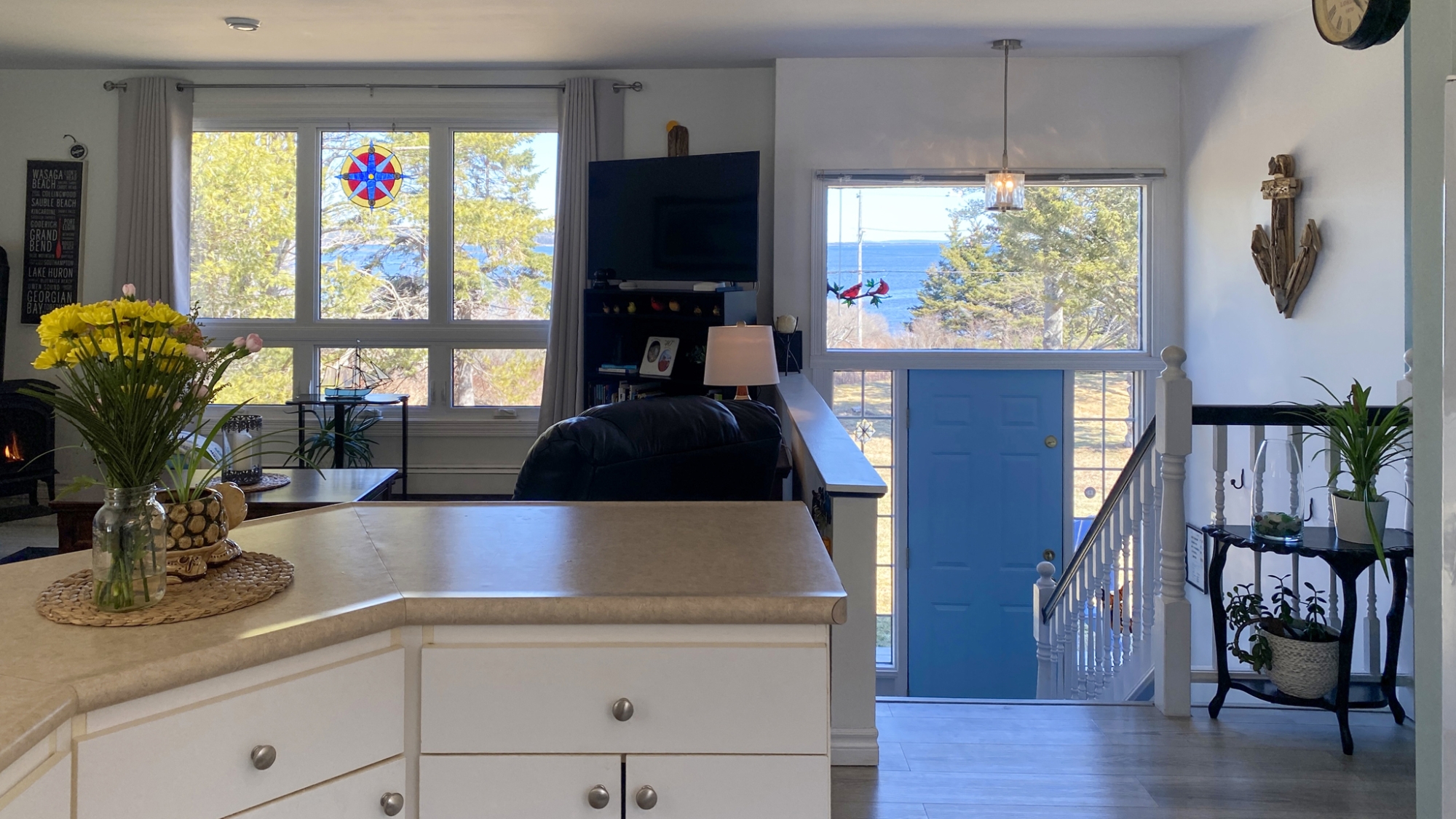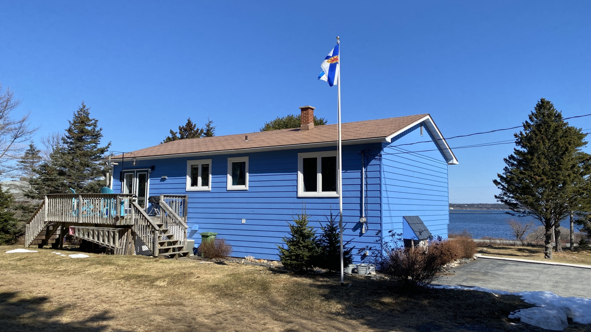 Set well off the road on a private 5-acre parcel is this cheerful 2 level coastal home.  The split-level design affords large windows on both floors, and pretty views from almost every window…watch tall ships in the distance sailing in and out of Lunenburg Bay, or closer to shore, local Lobsterman working their traps.