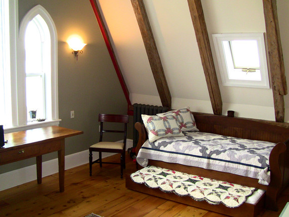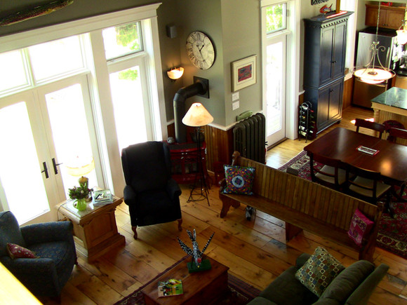 Kitchen, Dining and Living room areas share an open plan under awe inspiring hand-hewn beams and towering cathedral ceilings. A convenient Master suite on the main level offers space, storage and privacy while guests are treated to quarters in the loft gallery complete with full bath. And, for those very special little guests, a bedsitting room in the bell tower offers panoramic views of Kingsburg village and its sandy beach, the dramatic cliffs of Rose Head, and the majestic open Atlantic beyond.